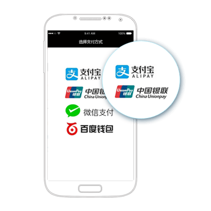 陪伴支付平台,为iOS/Android原生/H5 App提供支付解决方案:支持微信支付、支付宝支付、银联手机支付、百度钱包等。